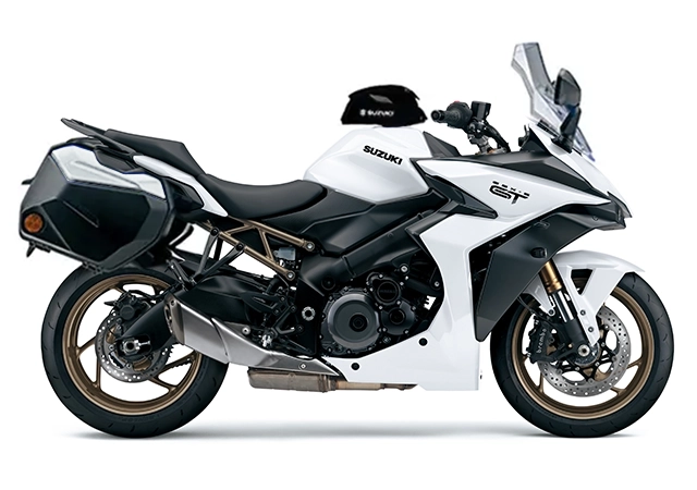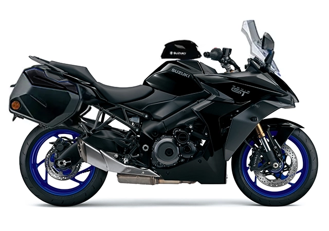 GSX-S1000GT w wersji Travel Pack wyposażony jest w kufry boczne z nakładkami w kolorze nadwozia, akcesoryjną wyższą szybę turystyczną, podgrzewane manetki oraz torbę typu tank bag.